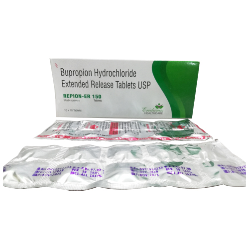 Best quality Bupropion cames under the brand name REPION-ER 150 with 150 mg of Bupropion Hydrochloride. It cames with the packing of 10×10 with MRP of ₹1130/- per box.